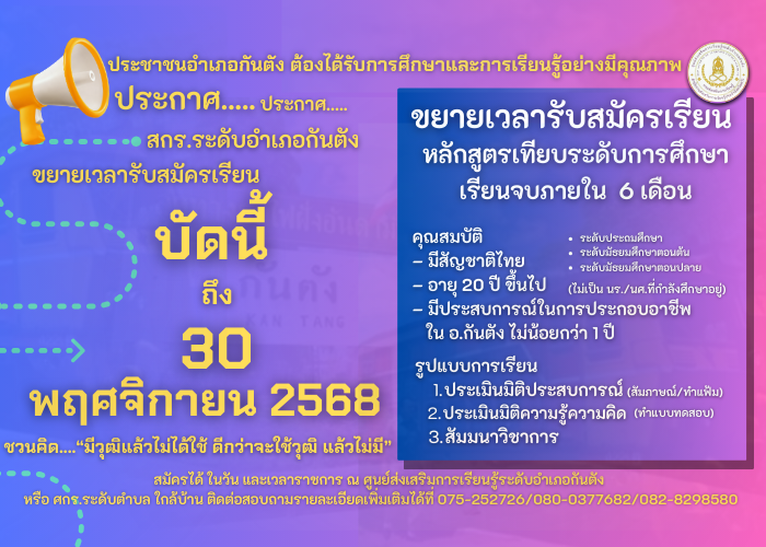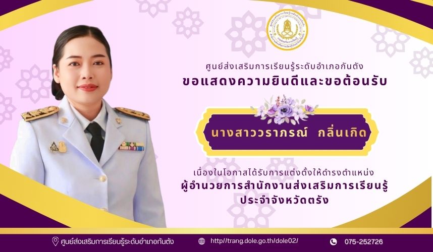 ศูนย์ส่งเสริมการเรียนรู้ระดับอำเภอกันตัง มุ่งมั่นที่จะพัฒนาคุณภาพการจัดการเรียนรู้อย่างต่อเนื่อง เพื่อให้ผู้เรียนทุกคนได้รับโอกาสในการเรียนรู้อย่างเต็มศักยภาพ เติบโตเป็นบุคคลที่มีคุณธรรม มีความรู้ มีความสามารถ มีทักษะชีวิต และพร้อมที่จะก้าวสู่อนาคตอย่างมั่นคง