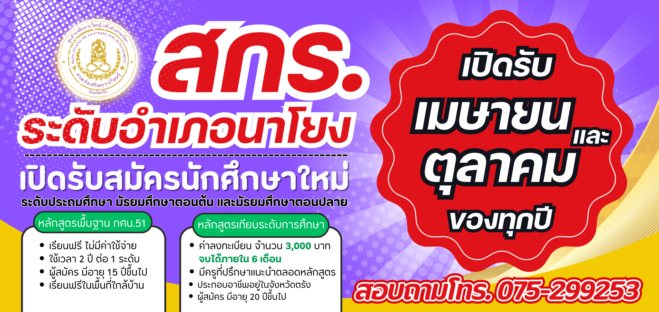 ยินดีต้อนรับท่านผู้ปกครองและผู้เรียนทุกคนเข้าสู่ครอบครัว สกร.ระดับอำเภอนาโยง เป็นบ้านหลังที่ 2 ที่เป็นแห่งการเรียนรู้ และพัฒนาอย่างแท้จริง จุดมุ่งหมายของการพัฒนาผู้เรียน ความจริงใจ เอาใจใส่ ความปลอดภัย และสร้างทักษะในการเรียนรู้ด้านต่างๆ แก่ผู้เรียนให้มากที่สุด ซึ่งสถานศึกษามีหน้าที่จัด ส่งเสริม และสนับสนุนการเรียนรู้ 3 รูปแบบ คือ การเรียนรู้ตลอดชีวิต การเรียนรู้เพื่อการพัฒนาตนเอง และการเรียนรู้เพื่อคุณวุฒิตามระดับ เพื่อมุ่งพัฒนาบุคคลให้มีทักษะการเรียนรู้ ทักษะอาชีพ และทักษะชีวิตที่สอดคล้องและเท่าทันพัฒนาการของโลก มีโอกาสพัฒนาหรือเพิ่มพูนทักษะของตนให้สูงขึ้น