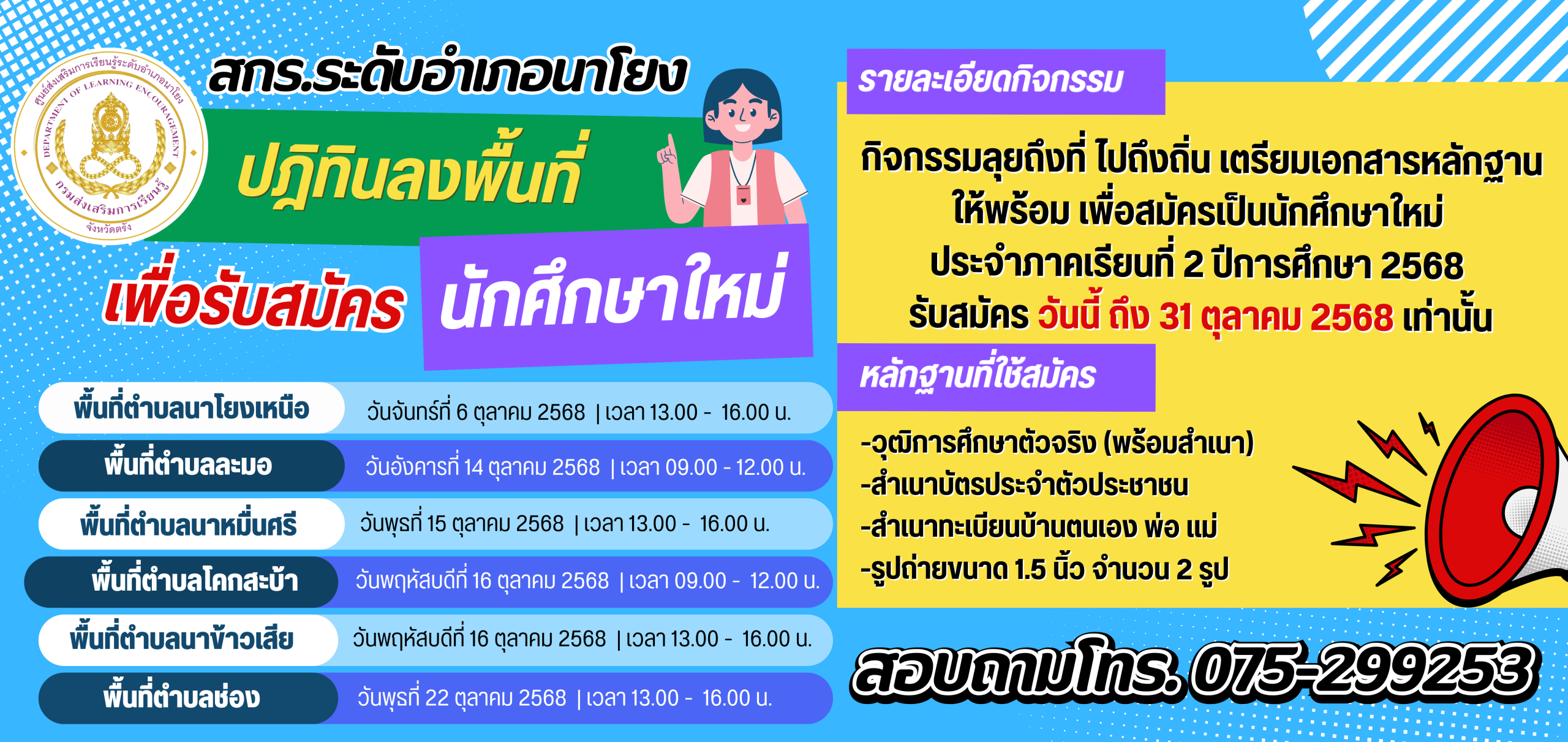 คุณครูขอถือโอกาสนี้ขอบคุณท่านผู้ปกครองที่ไว้วางใจส่งบุตรหลานมาศึกษาที่สกร.ระดับอำเภอนาโยง และให้การสนับสนุนสถานศึกษาด้วยดีเสมอมา รวมถึงขอบคุณศิษย์เก่าทุกรุ่นที่คิดถึง และคอยกลับเข้ามาเยี่ยมกันเสมอ ขอบคุณคณะครูทุกท่านสำหรับความรัก และการมีจิตวิญญาณของความเป็นครู ที่เป็นกุญแจสำคัญที่ทำให้เราสร้างผู้เรียน ที่เป็นคนเก่งและดีออกสู่สังคมตลอดมา