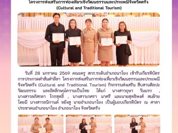 เข้ารับเกียรติบัตร การประกวดตำส้มตำลีลา โครงการส่งเสริมการท่องเที่ยวเชิงวัฒนธรรมและประเพณีจังหวัดตรัง (Cultural and Traditional Tourism) กิจกรรมส่งเสริม สืบสานศิลปะวัฒนธรรม และอัตลักษณ์ความเป็นไทย 30 ม.ค. 2569สกร.ระดับอำเภอนาโยงจดหมายข่าว
