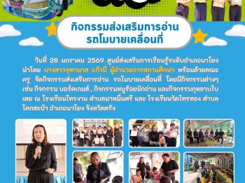 กิจกรรมส่งเสริมการอ่าน รถโมบายเคลื่อนที่ โดยมีกิจกรรมต่างๆ เช่น กิจกรรม บอร์ดเกมส์ , กิจกรรมหนูร้อยนักอ่าน และกิจกรรมกุหลาบใบเตย ณ โรงเรียนไทรงาม ตำบลนาหมื่นศรี และ โรงเรียนวัดไทรทอง ตำบลโคกสะบ้า อำเภอนาโยง จังหวัดตรัง 30 ม.ค. 2569สกร.ระดับอำเภอนาโยงจดหมายข่าว