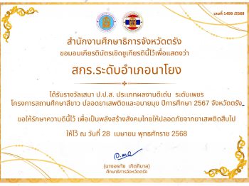 สกร.ระดับอำเภอนาโยง ได้รับรางวัลเสมา ป.ป.ส. ประเภทผลงานดีเด่น ระดับเพชร โครงการสถานศึกษาสีขาว ปลอดยาเสพติดและอบายมุข ปีการศึกษา 2566 จังหวัดตรัง 24 พ.ย. 2568สกร.ระดับอำเภอนาโยงรางวัล