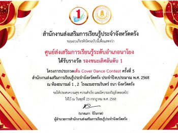 สกร.ระดับอำเภอนาโยง ได้รับรางวัลรองชนะเลิศอันดับ 1 โครงการประกวดเต้น Cover Dance Contest ครั้งที่ 5 สำนักงานส่งเสริมการเรียนรู้ประจำจังหวัดตรัง ประจำปีงประมาณ พ.ศ. 2568 24 พ.ย. 2568สกร.ระดับอำเภอนาโยงรางวัล