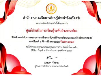 สกร.ระดับอำเภอนาโยง มีนักศึกษาเข้ารับการทดสอบทางการศึกษาระดับชาติด้านการศึกษานอกระบบโรงเรียน (N-NET) ภาคเรียนที่ 1 ปีการศึกษา 2568 ร้อยละ 87.27 24 พ.ย. 2568สกร.ระดับอำเภอนาโยงรางวัล