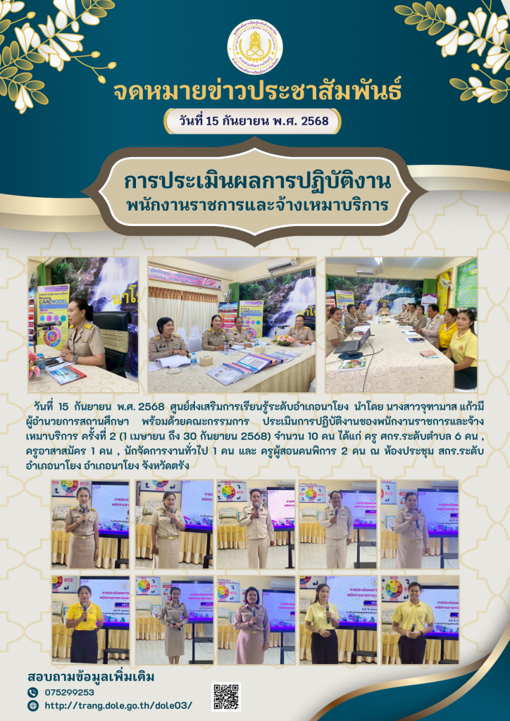 การประเมินผลการปฏิบัติงานพนักงานราชการและจ้างเหมาบริการ ครั้งที่ 2 (1 เมษายน – 30 กันยายน 2568) 18 ก.ย. 256819 ก.ย. 2025สกร.ระดับอำเภอนาโยงกิจกรรมภายใน, จดหมายข่าว