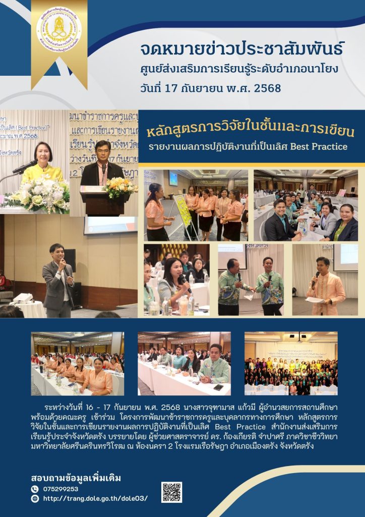 โครงการพัฒนาข้าราชการและบุคลากรทางการศึกษา หลักสูตรการวิจัยในชั้นเรียนและการเขียนรายงานผลการปฏิบัติงานที่เป็นเลิศ Best Practice 18 ก.ย. 256819 ก.ย. 2025สกร.ระดับอำเภอนาโยงกิจกรรมภายใน, จดหมายข่าว