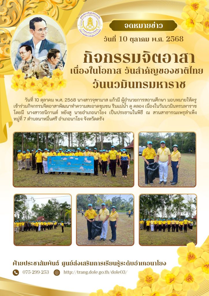 กิจกรรมจิตอาสาพัฒนาทำความสะอาดชุมชน ริมแม่น้ำ คู คลอง เนื่องในวันนวมินทรมหาราช 10 ต.ค. 256810 ต.ค. 2025สกร.ระดับอำเภอนาโยงจดหมายข่าว