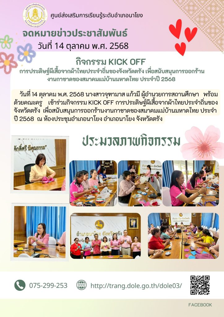 กิจกรรม KICK OFF การประดิษฐ์ผีเสื้อจากผ้าไทยประจำถิ่นของจังหวัดตรัง เพื่อสนับสนุนการออกร้านงานกาชาดของสมาคมแม่บ้านมหาดไทย ประจำปี 2568 14 ต.ค. 2568สกร.ระดับอำเภอนาโยงจดหมายข่าว