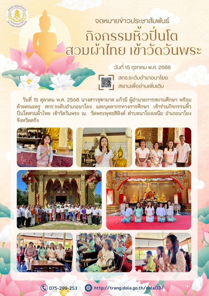 กิจกรรมหิ้วปิ่นโตสวมผ้าไทย เข้าวัดวันพระ ณ วัดพระพุทธสิหิงค์ ตำบลนาโยงเหนือ อำเภอนาโยง จังหวัดตรัง 15 ต.ค. 256815 ต.ค. 2025สกร.ระดับอำเภอนาโยงจดหมายข่าว