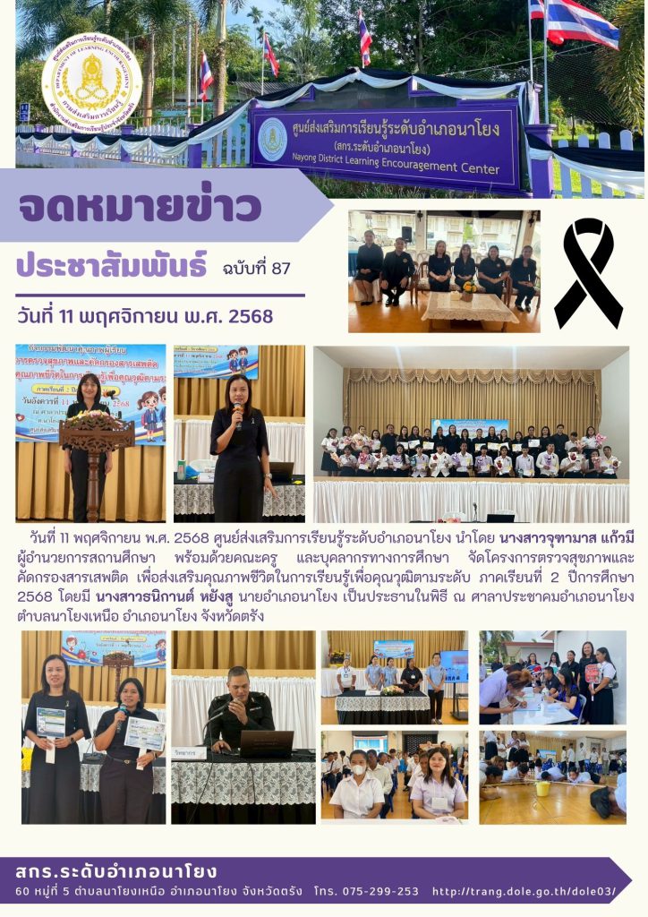 โครงการตรวจสุขภาพและคัดกรองสารเสพติด เพื่อส่งเสริมคุณภาพชีวิตในการเรียนรู้เพื่อคุณวุฒิตามระดับ ภาคเรียนที่ 2 ปีการศึกษา 2568 12 พ.ย. 256812 พ.ย. 2025สกร.ระดับอำเภอนาโยงจดหมายข่าว