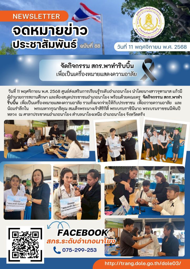 จัดกิจกรรม สกร.พาทำริบบิ้น เพื่อเป็นเครื่องหมายแสดงความอาลัย รวมทั้งแจกจ่ายให้กับประชาชน เพื่อถวายความอาลัย และน้อมรำลึกใน พระมหากรุณาธิคุณ สมเด็จพระนางเจ้าสิริกิติ์ พระบรมราชินีนาถ พระบรมราชชนนีพันปีหลวง 18 พ.ย. 256818 พ.ย. 2025สกร.ระดับอำเภอนาโยงจดหมายข่าว