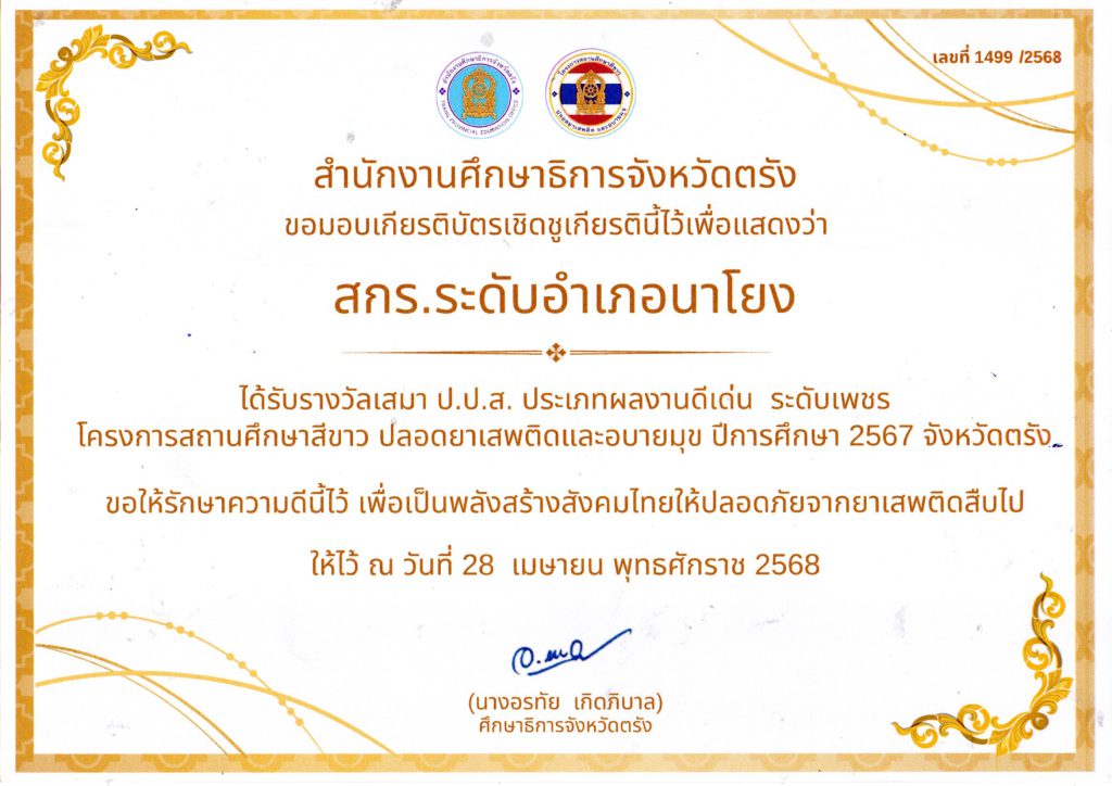 สกร.ระดับอำเภอนาโยง ได้รับรางวัลเสมา ป.ป.ส. ประเภทผลงานดีเด่น ระดับเพชร โครงการสถานศึกษาสีขาว ปลอดยาเสพติดและอบายมุข ปีการศึกษา 2567 จังหวัดตรัง 24 พ.ย. 2568สกร.ระดับอำเภอนาโยงรางวัล