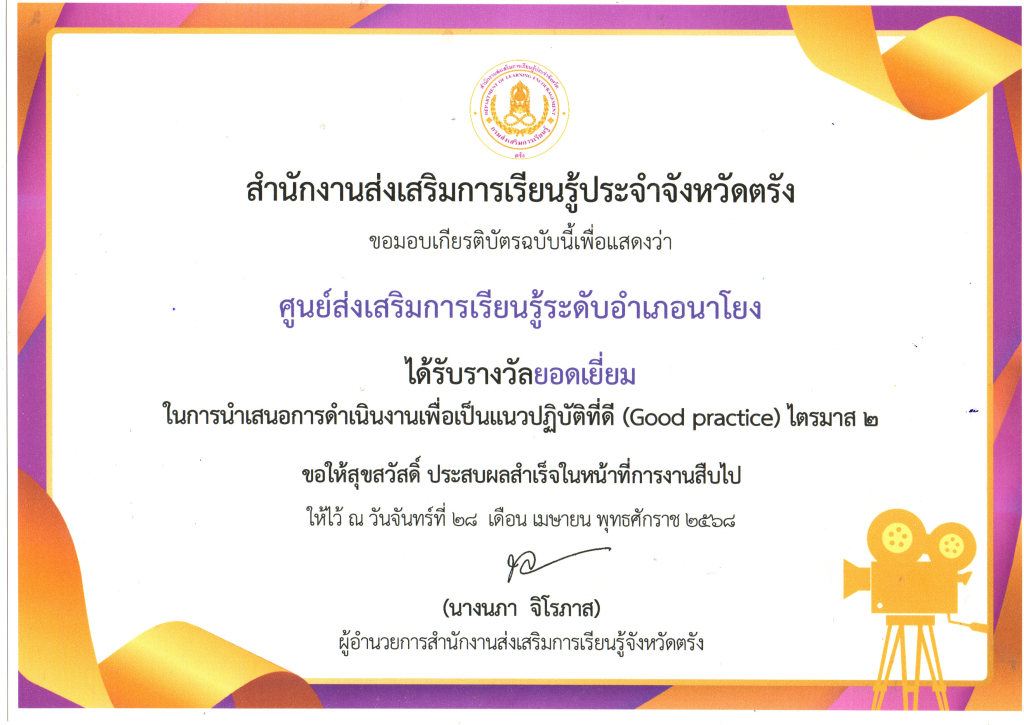 สกร.ระดับอำเภอนาโยง ได้รับรางวัลยอดเยี่ยม ในการนำเสนอการดำเนินงานเพื่อเป็นแนวปฏิบัติที่ดี (Good practice) ไตรมาส 2 24 พ.ย. 2568สกร.ระดับอำเภอนาโยงรางวัล