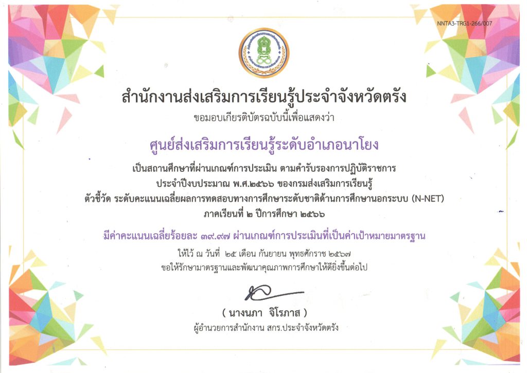 สกร.ระดับอำเภอนาโยง เป็นสถานศึกษาที่ผ่านเกณฑ์การประเมิน ตามคำรับรองการปฏิบัฏิบัติราชการ ประจำปีงบประมาณ พ.ศ. 2566 ของกรมส่งเสริมการเรียนรู้ ตัวชี้วัด ระดับคะแนนเฉลี่ยผลการทดสอบทางการศึกษาระดับชาติด้านการศึกษานอกระบบ (N-NET) ภาคเรียนที่ 2 ปีการศึกษา 2566 24 พ.ย. 2568สกร.ระดับอำเภอนาโยงรางวัล