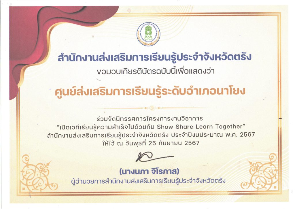 สกร.ระดับอำเภอนาโยง ร่วมจัดนิทรรศการโครงการงานวิชาการ “เปิดเวทีเรียนรู้ความสำเร็จไปด้วยกัน Show Share Learn Together” สำนักงานส่งเสริมการเรียนรู้ประจำจังหวัดตรัง ประจำบึงบประมาณาณ พ.ศ. 2567 24 พ.ย. 2568สกร.ระดับอำเภอนาโยงรางวัล