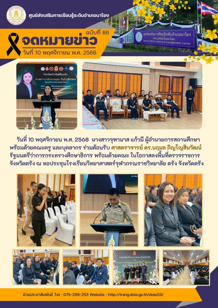 ร่วมต้อนรับ ศาสตราจารย์ ดร.นฤมล ภิญโญสินวัฒน์ รัฐมนตรีว่าการกระทรวงศึกษาธิการ พร้อมด้วยคณะ ในโอกาสลงพื้นที่ตรวจราชการ จังหวัดตรัง ณ หอประชุมโรงเรียนวิทยาศาสตร์จุฬาภรณราชวิทยาลัย ตรัง จังหวัดตรัง 4 ธ.ค. 2568สกร.ระดับอำเภอนาโยงจดหมายข่าว