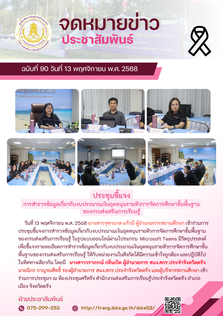 ประชุมชี้แจง การสำรวจข้อมูลเกี่ยวกับงบประมาณเงินอุดหนุนรายหัวการจัดการศึกษาขั้นพื้นฐาน ของกรมส่งเสริมการเรียนรู้ 4 ธ.ค. 25684 ธ.ค. 2025สกร.ระดับอำเภอนาโยงจดหมายข่าว