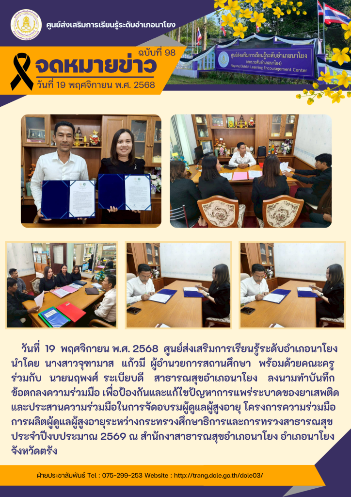 งนามทำบันทึก ข้อตกลงความร่วมมือ เพื่อป้องกันและแก้ไขปัญหาการแพร่ระบาดของยาเสพติด และประสานความร่วมมือในการจัดอบรมผู้ดูแลผู้สูงอายุ โครงการความร่วมมือการผลิตผู้ดูแลผู้สูงอายุระหว่างกระทรวงศึกษาธิการและกระทรวงสาธารณสุข ประจำปีงบประมาณ 2569 ณ สำนักงานสาธารณสุขอำเภอนาโยง อำเภอนาโยง จังหวัดตรัง 9 ธ.ค. 2568สกร.ระดับอำเภอนาโยงจดหมายข่าว