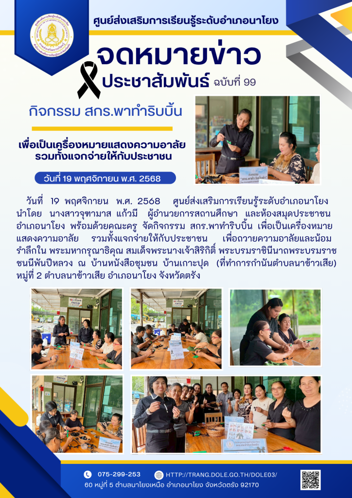 กิจกรรม สกร.พาทำริบบิ้น เพื่อเป็นเครื่องหมายแสดงความอาลัย รวมทั้งแจกจ่ายให้กับประชาชน 9 ธ.ค. 2568สกร.ระดับอำเภอนาโยงจดหมายข่าว