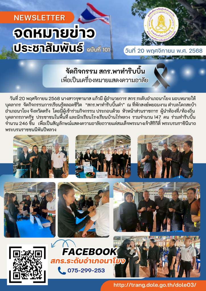 จัดกิจกรรมการเรียนรู้ตลอดชีวิต “สกร.พาทำริบบิ้นดำ” ณ ที่พักสงฆ์พยอมงาม ตำบลโคกสะบ้า อำเภอนาโยง จังหวัดตรัง 9 ธ.ค. 2568สกร.ระดับอำเภอนาโยงจดหมายข่าว