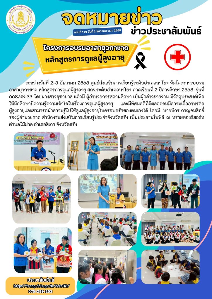 โครงการอบรมอาสายุวกาชาด หลักสูตรการดูแลผู้สูงอายุ สกร.ระดับอำเภอนาโยง ภาคเรียนที่ 2 ปีการศึกษา 2568 รุ่นที่ 668/ตง.33 30 ม.ค. 2569สกร.ระดับอำเภอนาโยงจดหมายข่าว