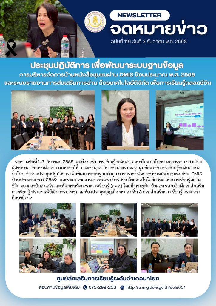 ประชุมปฏิบัติการเพื่อพัฒนาระบบฐานข้อมูล การบริหารจัดการบ้านหนังสือชุมชนผ่าน DMIS ปีงบประมาณ พ.ศ. 2569 และระบบรายงานการส่งเสริมการอ่าน ด้วยเทคโนโลยีดิจิทัล เพื่อการเรียนรู้ตลอดชีวิต ของสถาบันส่งเสริมและพัฒนานวัตกรรมการเรียนรู้ (สพร.) 30 ม.ค. 2569สกร.ระดับอำเภอนาโยงจดหมายข่าว