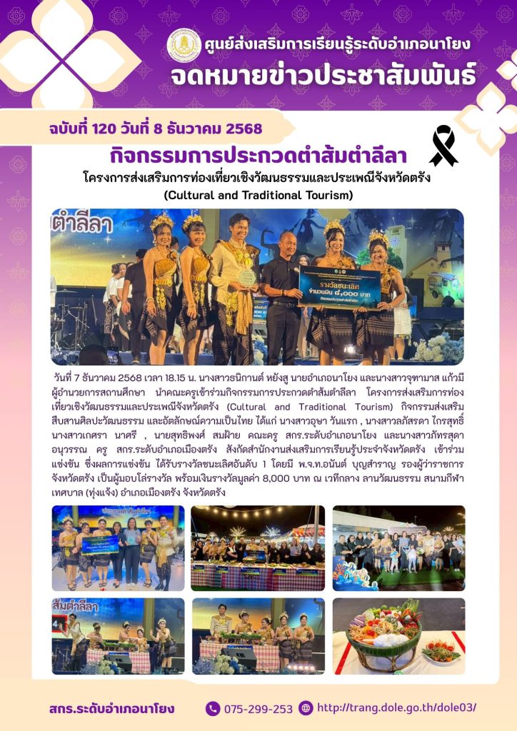 กิจกรรมการประกวดตำส้มตำลีลา โครงการส่งเสริมการท่องเที่ยวเชิงวัฒนธรรมและประเพณีจังหวัดตรัง (Cultural and Traditional Tourism) กิจกรรมส่งเสริม สืบสานศิลปะวัฒนธรรม และอัตลักษณ์ความเป็นไทย 30 ม.ค. 2569สกร.ระดับอำเภอนาโยงจดหมายข่าว