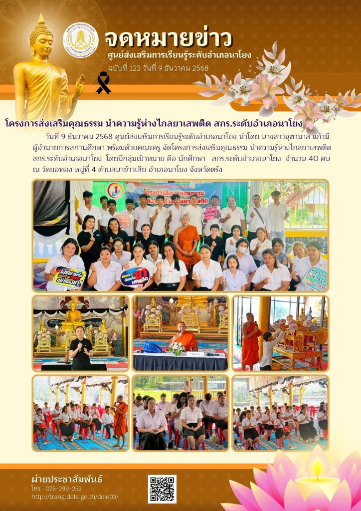 โครงการส่งเสริมคุณธรรม นำความรู้ห่างไกลยาเสพติด สกร.ระดับอำเภอนาโยง 30 ม.ค. 2569สกร.ระดับอำเภอนาโยงจดหมายข่าว