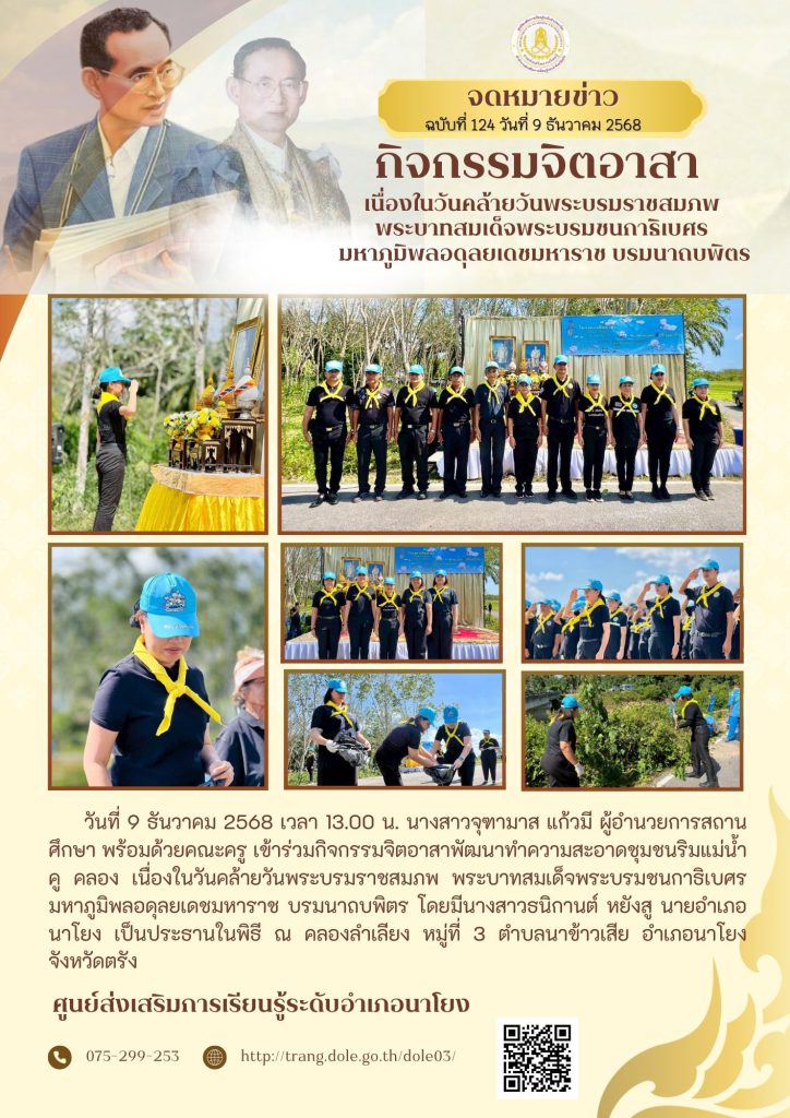กิจกรรมจิตอาสาพัฒนาทำความสะอาดชุมชนริมแม่น้ำ คู คลอง เนื่องในวันคล้ายวันพระบรมราชสมภพ พระบาทสมเด็จพระบรมชนกาธิเบศร มหาภูมิพลอดุลยเดชมหาราช บรมนาถบพิตร 30 ม.ค. 2569สกร.ระดับอำเภอนาโยงจดหมายข่าว