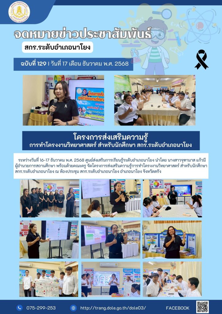 โครงการส่งเสริมความรู้การทำโครงงานวิทยาศาสตร์ สำหรับนักศึกษา สกร.ระดับอำเภอนาโยง 30 ม.ค. 2569สกร.ระดับอำเภอนาโยงจดหมายข่าว