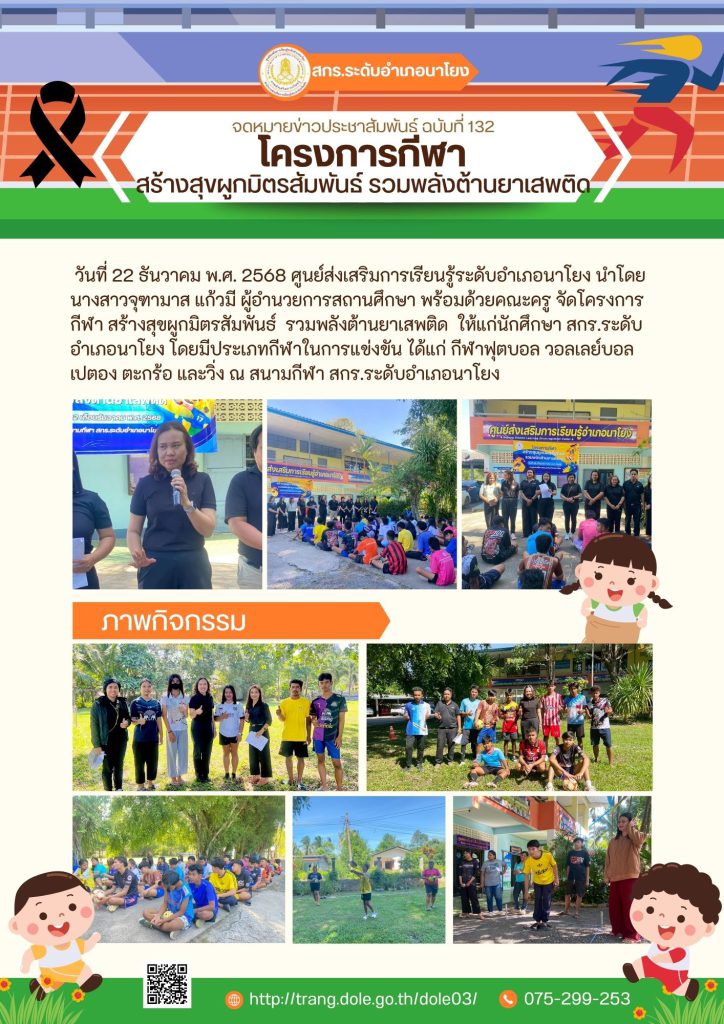 โครงการกีฬา สร้างสุขผูกมิตรสัมพันธ์ รวมพลังต้านยาเสพติด ให้แก่นักศึกษา สกร.ระดับอำเภอนาโยง 30 ม.ค. 2569สกร.ระดับอำเภอนาโยงจดหมายข่าว
