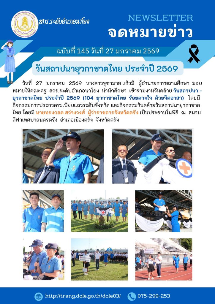 งานวันคล้ายวันสถาปนายุวกาชาดไทย ประจำปี 2569 (104 ยุวกาชาดไทย ร้อยดวงใจ ด้วยจิตอาสา) 30 ม.ค. 2569สกร.ระดับอำเภอนาโยงจดหมายข่าว