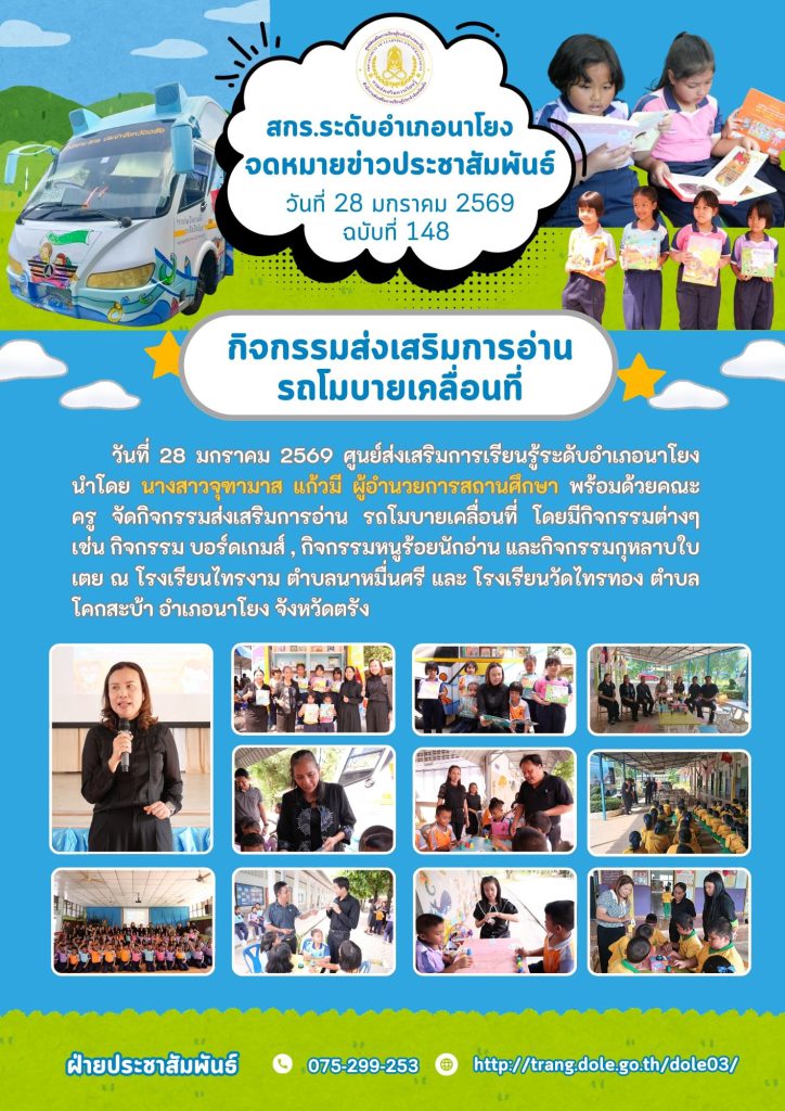 กิจกรรมส่งเสริมการอ่าน รถโมบายเคลื่อนที่ โดยมีกิจกรรมต่างๆ เช่น กิจกรรม บอร์ดเกมส์ , กิจกรรมหนูร้อยนักอ่าน และกิจกรรมกุหลาบใบเตย ณ โรงเรียนไทรงาม ตำบลนาหมื่นศรี และ โรงเรียนวัดไทรทอง ตำบลโคกสะบ้า อำเภอนาโยง จังหวัดตรัง 30 ม.ค. 2569สกร.ระดับอำเภอนาโยงจดหมายข่าว