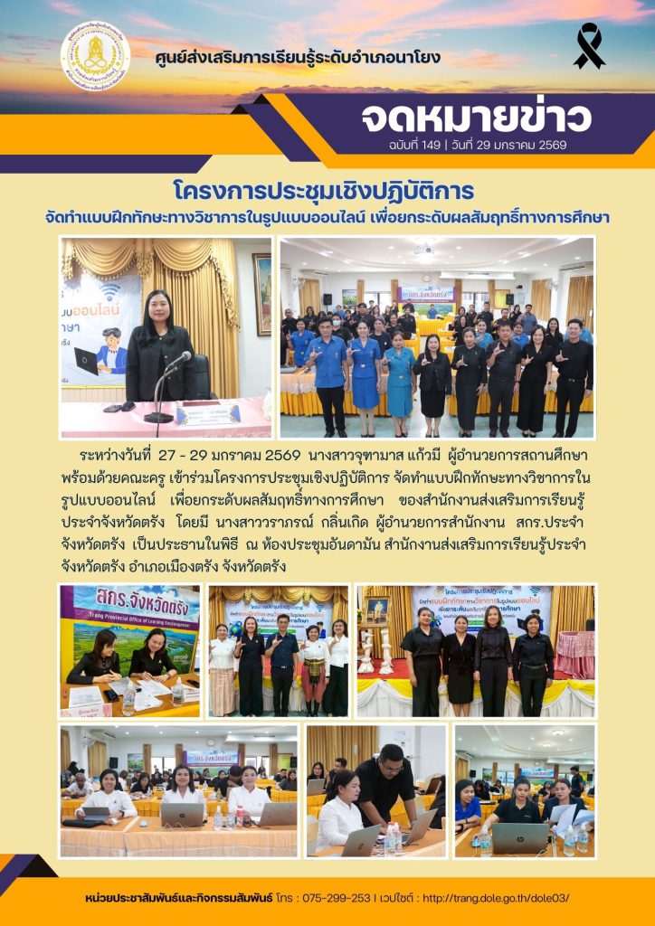 โครงการประชุมเชิงปฏิบัติการ จัดทำแบบฝึกทักษะทางวิชาการในรูปแบบออนไลน์ เพื่อยกระดับผลสัมฤทธิ์ทางการศึกษาของสำนักงานส่งเสริมการเรียนรู้ประจำจังหวัดตรัง 30 ม.ค. 2569สกร.ระดับอำเภอนาโยงจดหมายข่าว