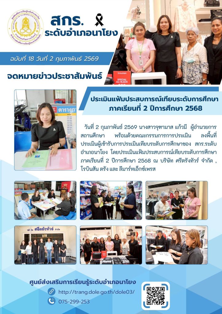 ประเมินแฟ้มประสบการณ์เทียบระดับการศึกษา ภาคเรียนที่ 2 ปีการศึกษา 2568 ณ บริษัท ศรีตรังทัวร์ จำกัด , โรบินสัน ตรัง และ ลีมาร์ทเอ็กซ์เพรส 5 ก.พ. 2569สกร.ระดับอำเภอนาโยงจดหมายข่าว