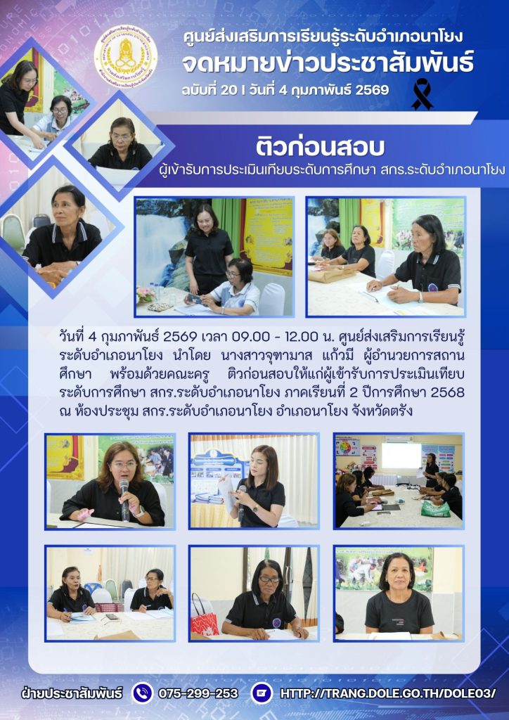 ติวก่อนสอบให้แก่ผู้เข้ารับการประเมินเทียบระดับการศึกษา สกร.ระดับอำเภอนาโยง ภาคเรียนที่ 2 ปีการศึกษา 2568 5 ก.พ. 2569สกร.ระดับอำเภอนาโยงจดหมายข่าว