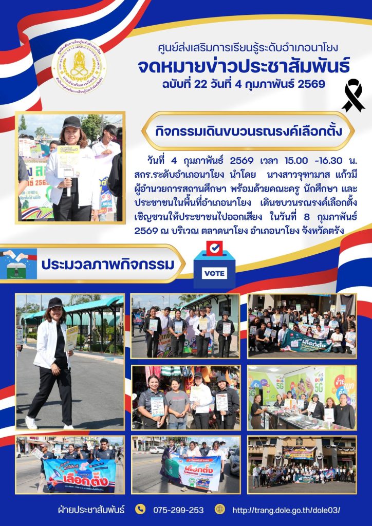 เดินขบวนรณรงค์เลือกตั้ง เชิญชวนให้ประชาชนไปออกเสียง ในวันที่ 8 กุมภาพันธ์ 2569 ณ บริเวณ ตลาดนาโยง อำเภอนาโยง จังหวัดตรัง 5 ก.พ. 2569สกร.ระดับอำเภอนาโยงจดหมายข่าว