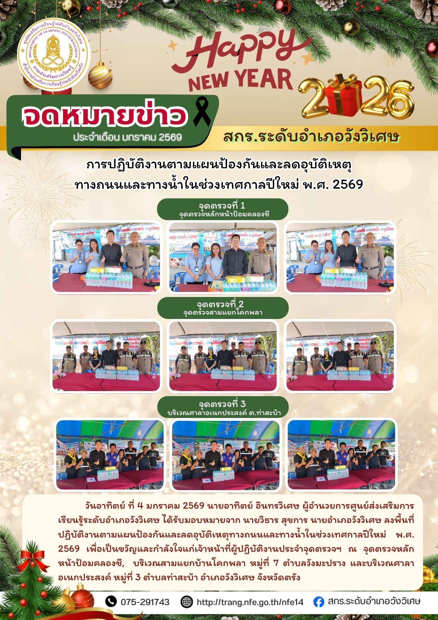 กิจกรรมประชาสัมพันธ์ ลงพื้นที่ปฏิบัติงานตามแผนป้องกันและลดอุบัติเหตุทางถนนและทางน้ำในช่วงเทศกาลปีใหม่ พ.ศ. 2569 เพื่อเป็นขวัญและกำลังใจแก่เจ้าหน้าที่ผู้ปฏิบัติงานประจำจุดตรวจฯ จำนวนผู้เข้าชม: 1