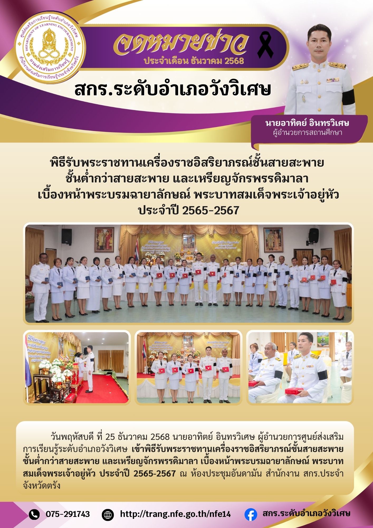กิจกรรมประชาสัมพันธ์ เข้าพิธีรับพระราชทานเครื่องราชอิสริยาภรณ์ชั้นสายสะพาย ชั้นต่ำกว่าสายสะพาย และเหรียญจักรพรรดิมาลา เบื้องหน้าพระบรมฉายาลักษณ์ พระบาทสมเด็จพระเจ้าอยู่หัว ประจำปี 2565-2567 ณ ห้องประชุมอันดามัน สำนักงาน สกร.ประจำจังหวัดตรัง จำนวนผู้เข้าชม: 6