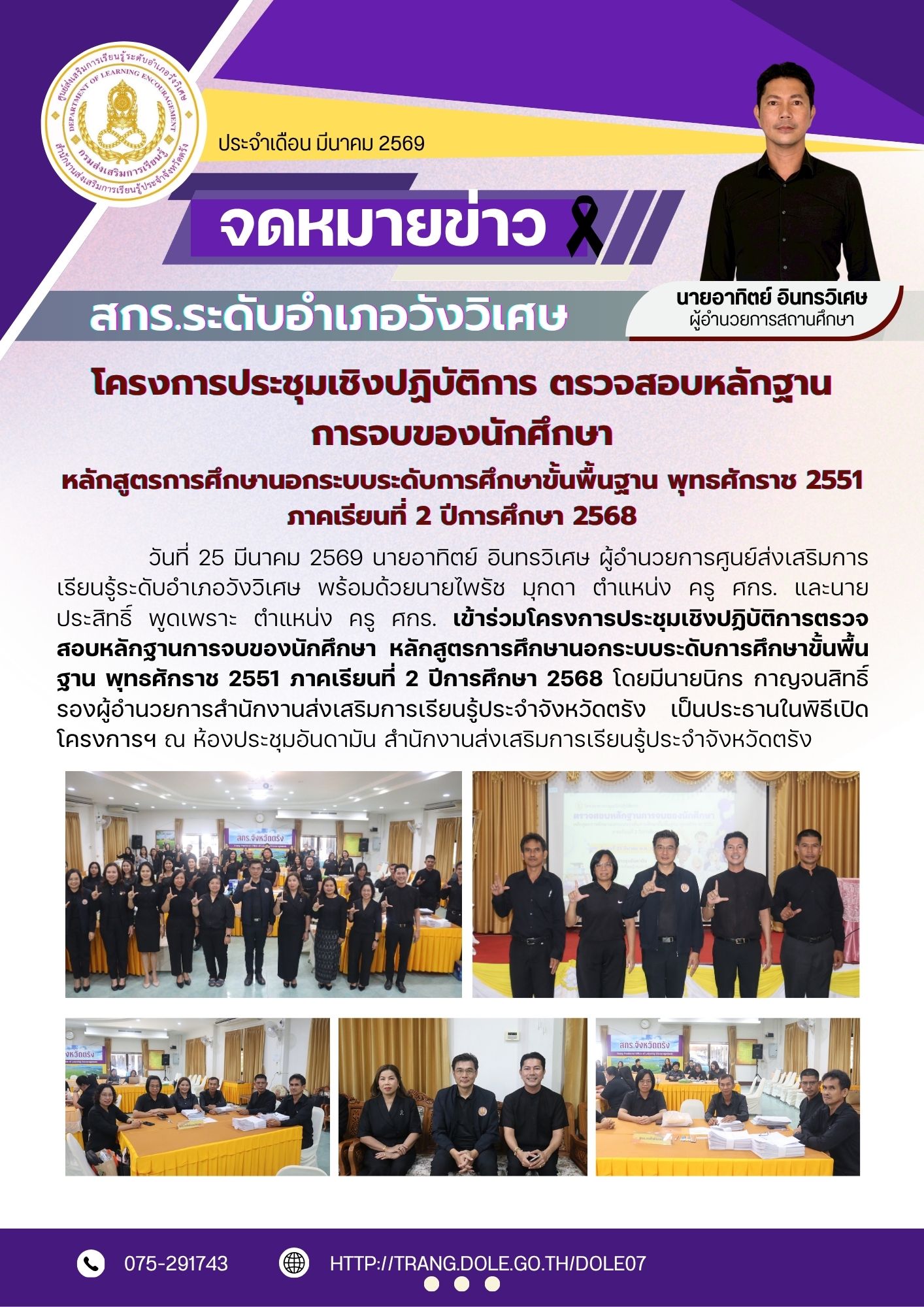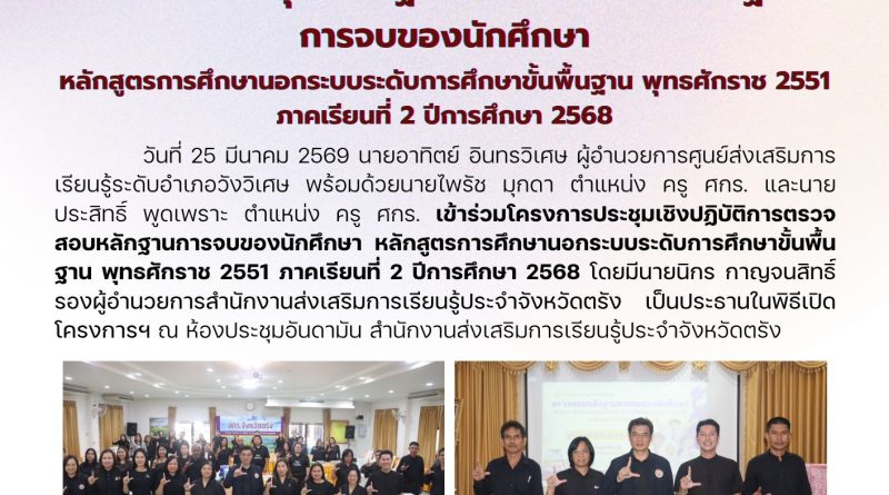 วันที่ 25 มีนาคม 2569 นายอาทิตย์ อินทรวิเศษ ผู้อำนวยการศูนย์ส่งเสริมการเรียนรู้ระดับอำเภอวังวิิเศษ พร้อมด้วยนายไพรัช มุกดา ตำแหน่ง ครู ศกร. และนายประสิทธิ์ พูดเพราะ ตำแหน่ง ครู ศกร. เข้าร่วมโครงการประชุมเชิงปฏิบัติการตรวจสอบหลักฐานการจบของนักศึกษา หลักสูตรการศึกษานอกระบบระดับการศึกษาขั้นพื้นฐาน พุทธศักราช 2551 ภาคเรียนที่ 2 ปีการศึกษา 2568 โดยมีนายนิกร กาญจนสิทธิ์ รองผู้อำนวยการสำนักงานส่งเสริมการเรียนรู้ประจำจังหวัดตรัง เป็นประธานในพิธีเปิดโครงการฯ ณ ห้องประชุมอันดามัน สำนักงานส่งเสริมการเรียนรู้ประจำจังหวัดตรัง
