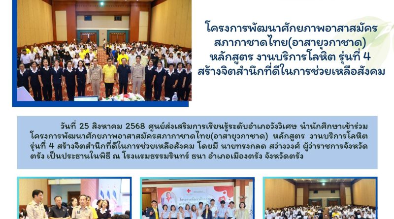 กิจกรรม นักศึกษาเข้าร่วมโครงการพัฒนาศักยภาพอาสาสมัครสภากาชาดไทย(อาสายุวกาชาด) หลักสูตร งานบริการโลหิต รุ่นที่ 4 สร้างจิตสำนึกที่ดีในการช่วยเหลือสังคม จำนวนผู้เข้าชม: 2