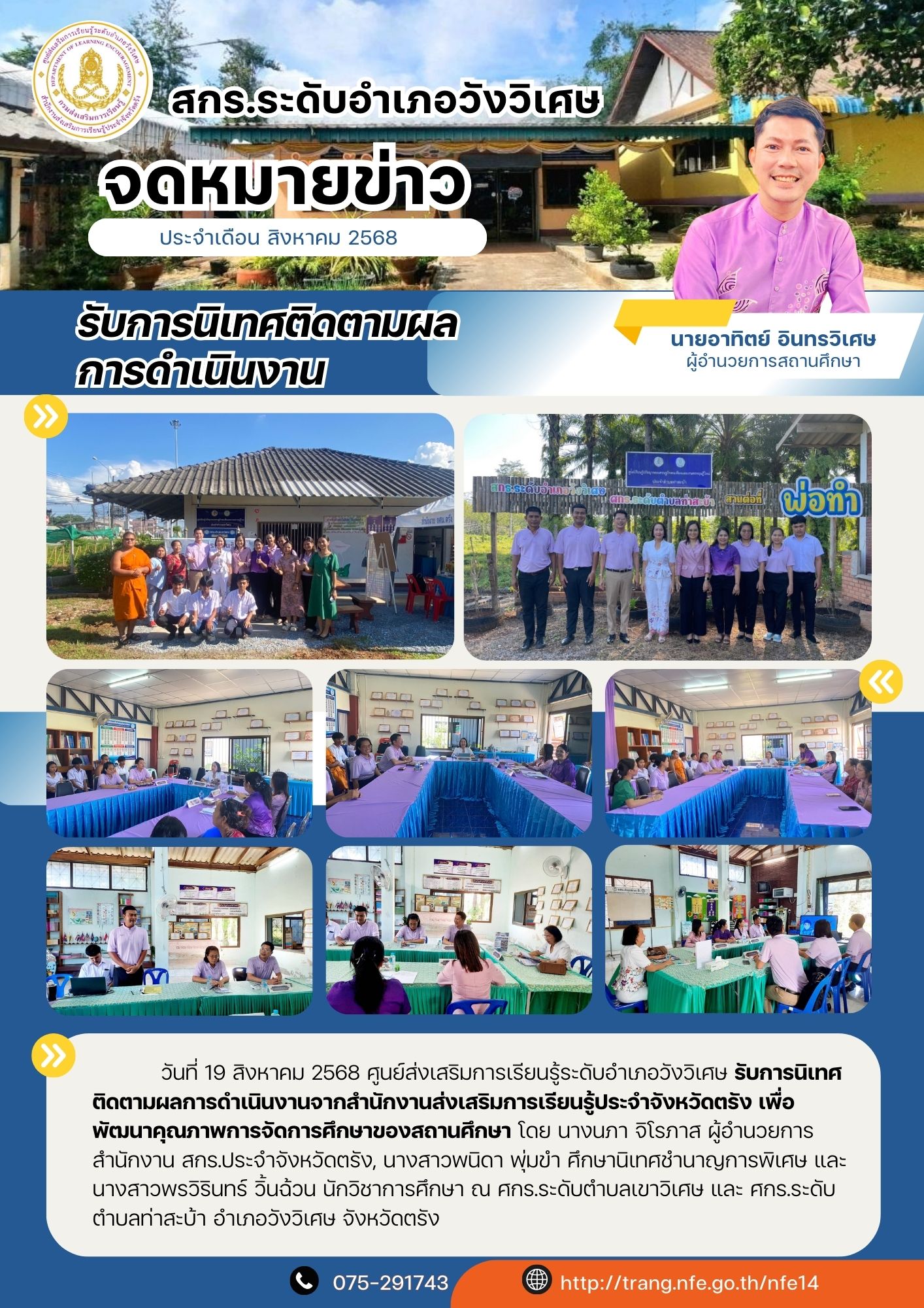 กิจกรรม ศูนย์ส่งเสริมการเรียนรู้ระดับอำเภอวังวิเศษ รับการนิเทศติดตามผลการดำเนินงานจากสำนักงานส่งเสริมการเรียนรู้ประจำจังหวัดตรัง เพื่อพัฒนาคุณภาพการจัดการศึกษาของสถานศึกษา จำนวนผู้เข้าชม: 2