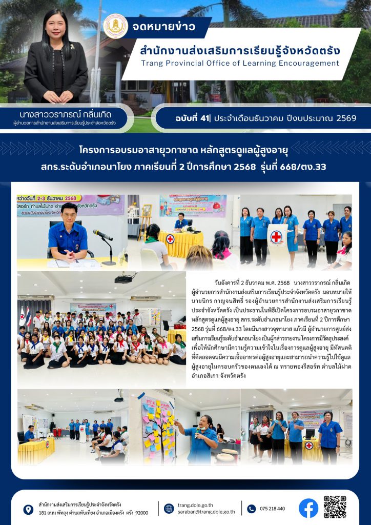 โครงการอบรมอาสายุวกาชาด หลักสูตรดูแลผู้สูงอายุ สกร.ระดับอำเภอนาโยง 2 ธ.ค. 2568Admin Systemกิจกรรม จำนวนผู้เข้าชม: 1