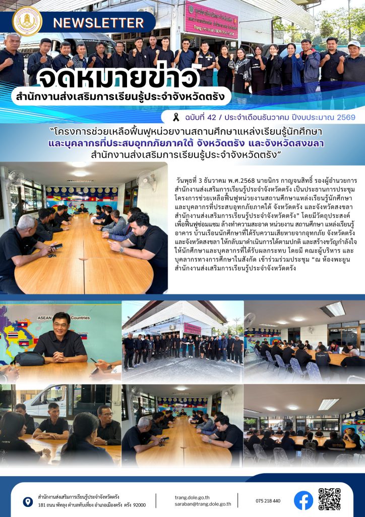 การประชุมโครงการช่วยเหลือฟื้นฟูหน่วยงานสถานศึกษาแหล่งเรียนรู้นักศึกษาและบุคลากรที่ประสบอุทกภัยภาคใต้ จังหวัดตรัง และจังหวัดสงขลา 3 ธ.ค. 2568Admin Systemกิจกรรม จำนวนผู้เข้าชม: 2