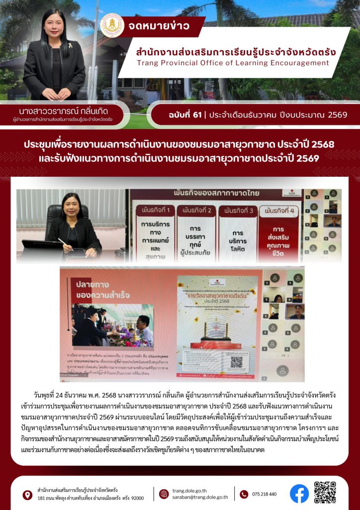 รายงานผลการดำเนินงานของชมรมอาสายุวกาชาด ประจำปี 2568 และรับฟังแนวทางการดำเนินงานชมรมอาสายุวกาชาดประจำปี 2569 ผ่านระบบออนไลน์ 29 ธ.ค. 2568Admin Systemกิจกรรม จำนวนผู้เข้าชม: 0