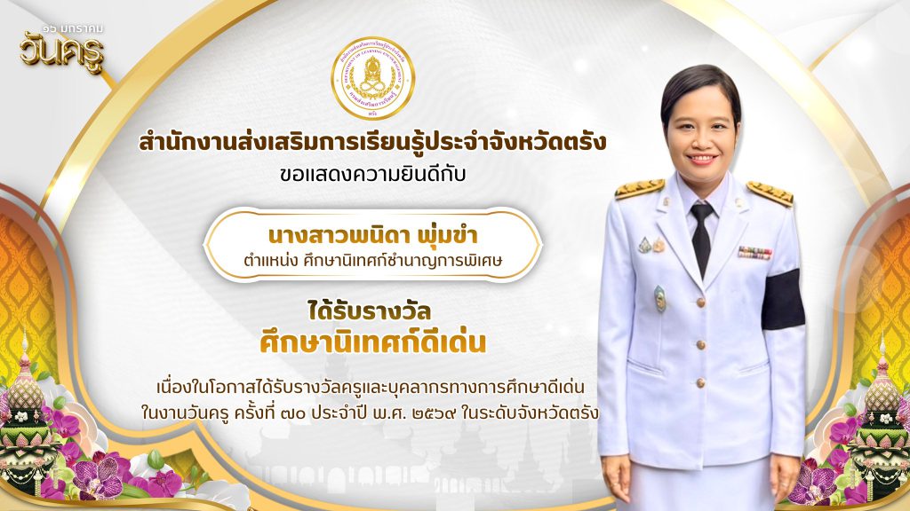 ศึกษานิเทศก์ดีเด่น เนื่องในโอกาสได้รับรางวัลครูและบุคลากรทางการศึกษาดีเด่น ในงานวันครู ครั้งที่ ๗๐ ประจำปี พ.ศ. ๒๕๖๙ ในระดับจังหวัดตรัง 5 ก.พ. 2569Admin Systemรางวัล จำนวนผู้เข้าชม: 1