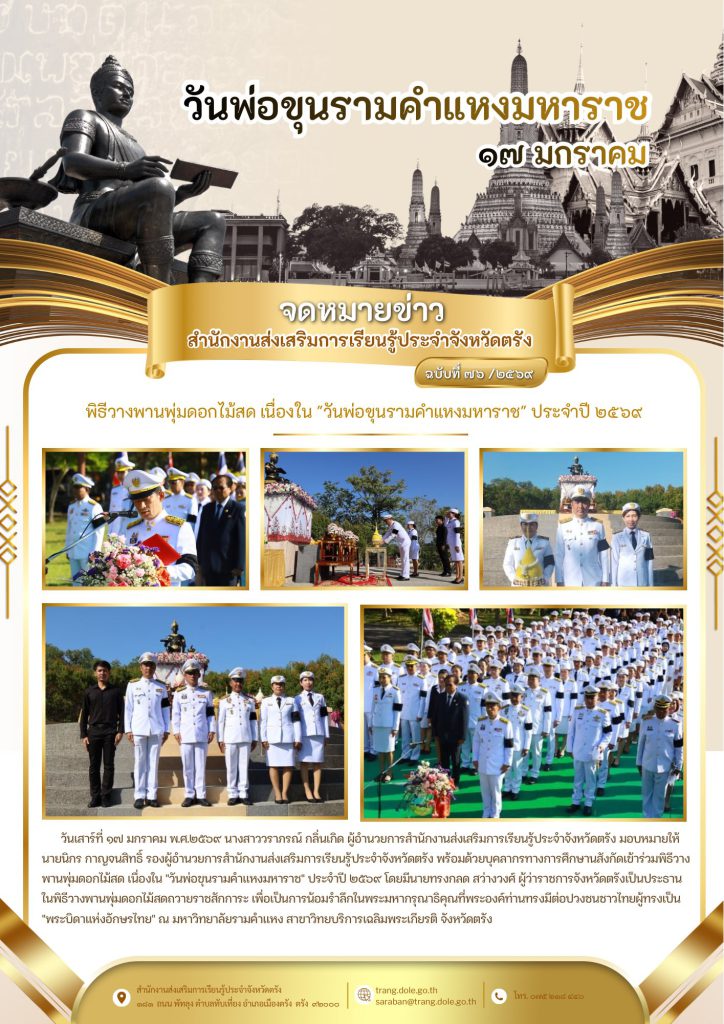 พิธีวางพานพุ่มดอกไม้สด เนื่องใน “วันพ่อขุนรามคำแหงมหาราช” ประจำปี ๒๕๖๙ 5 ก.พ. 2569Admin Systemประชาสัมพันธ์ กิจกรรม สกร.ประจำจังหวัดตรัง จำนวนผู้เข้าชม: 0