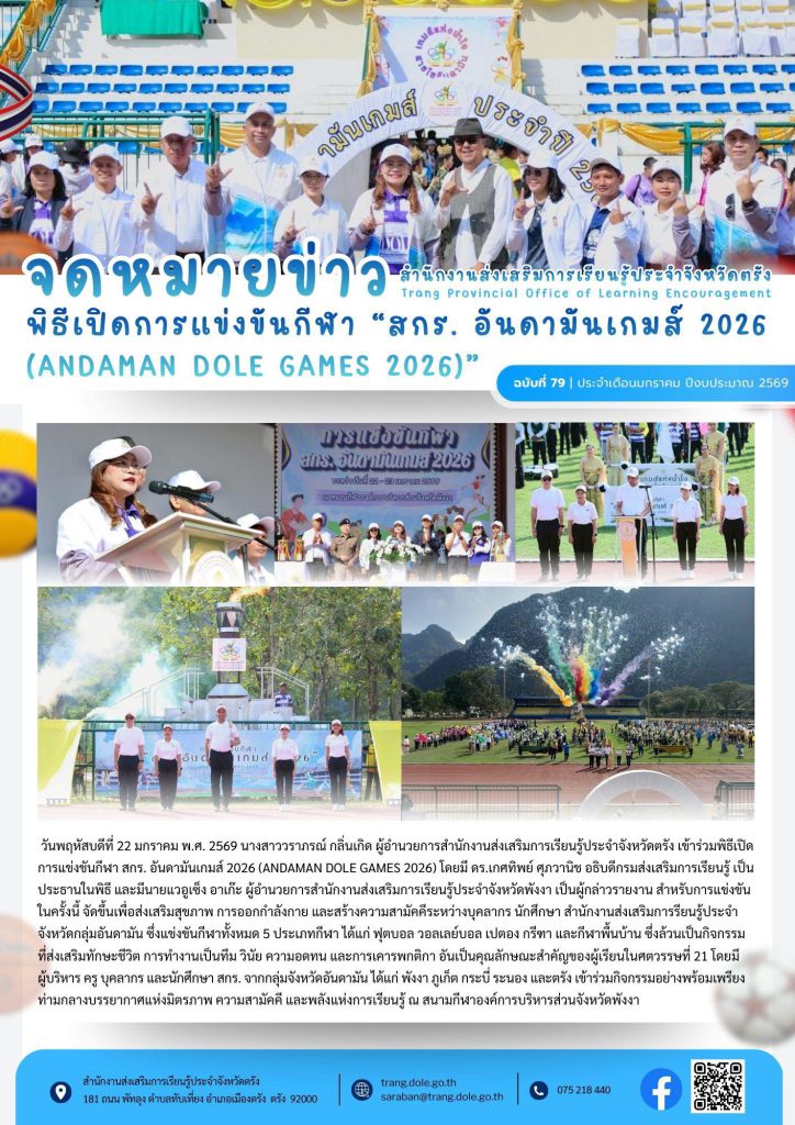พิธีเปิดการแข่งขันกีฬา สกร. อันดามันเกมส์ 2026 5 ก.พ. 2569Admin Systemประชาสัมพันธ์ กิจกรรม สกร.ประจำจังหวัดตรัง จำนวนผู้เข้าชม: 2