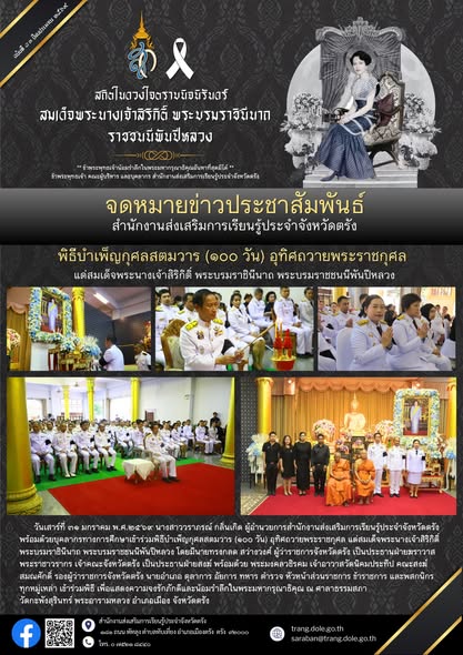 พิธีบำเพ็ญกุศลสตมวาร (๑๐๐ วัน) อุทิศถวายพระราชกุศล แด่สมเด็จพระนางเจ้าสิริกิติ์ พระบรมราชินีนาถ พระบรมราชชนนีพันปีหลวง 5 ก.พ. 2569Admin Systemกิจกรรม จำนวนผู้เข้าชม: 1
