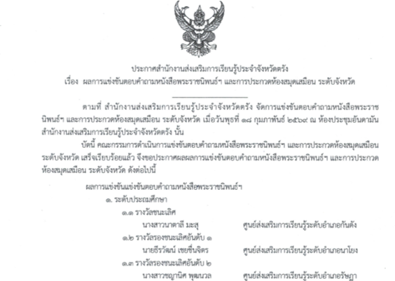 ประกาศผลการแข่งขันตอบคำถามหนังสือพระราชนิพนธ์ฯ